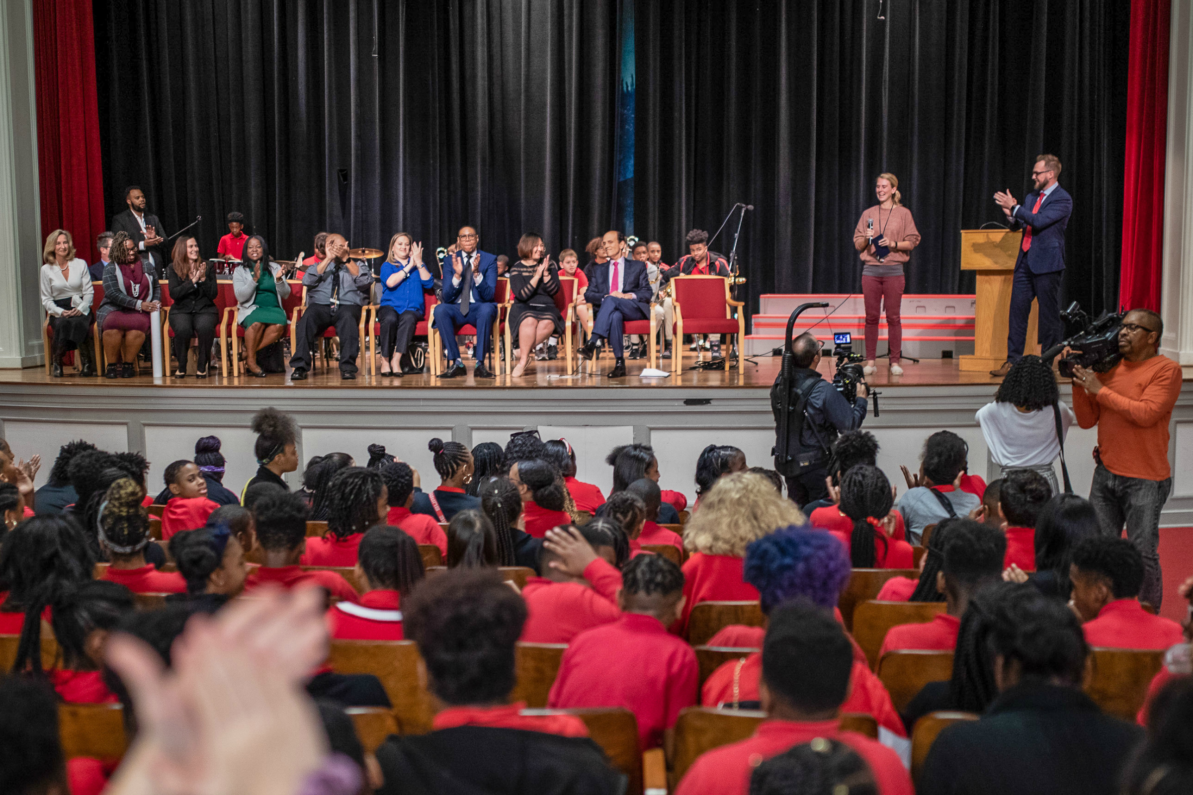 Stuart-Hobson Middle School | Washington, DC | Oct 29, 2019Milken Educator Award recipient Claire Smullen gets another rousing ovation as she prepares to say a few words at her surprise notification. In addition to her work in the classroom, Claire chairs the school’s electives department, sits on the school leadership team and leads professional development for the district’s art teachers each year.