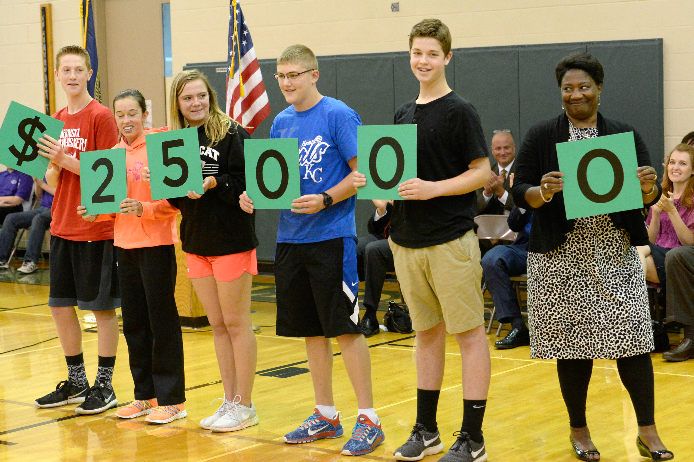 Beadle Middle School | Omaha, NE | Oct 21, 2015Dr. Jane Foley, Milken Educator Awards Senior Vice President, enlists student volunteers to write out the amount of the award one Beadle Middle School teacher is about to receive. Dr. Deborah Frison, Deputy Commissioner of School Improvement for the Nebraska Department of Education, holds up the last zero. It adds up to $25,000!