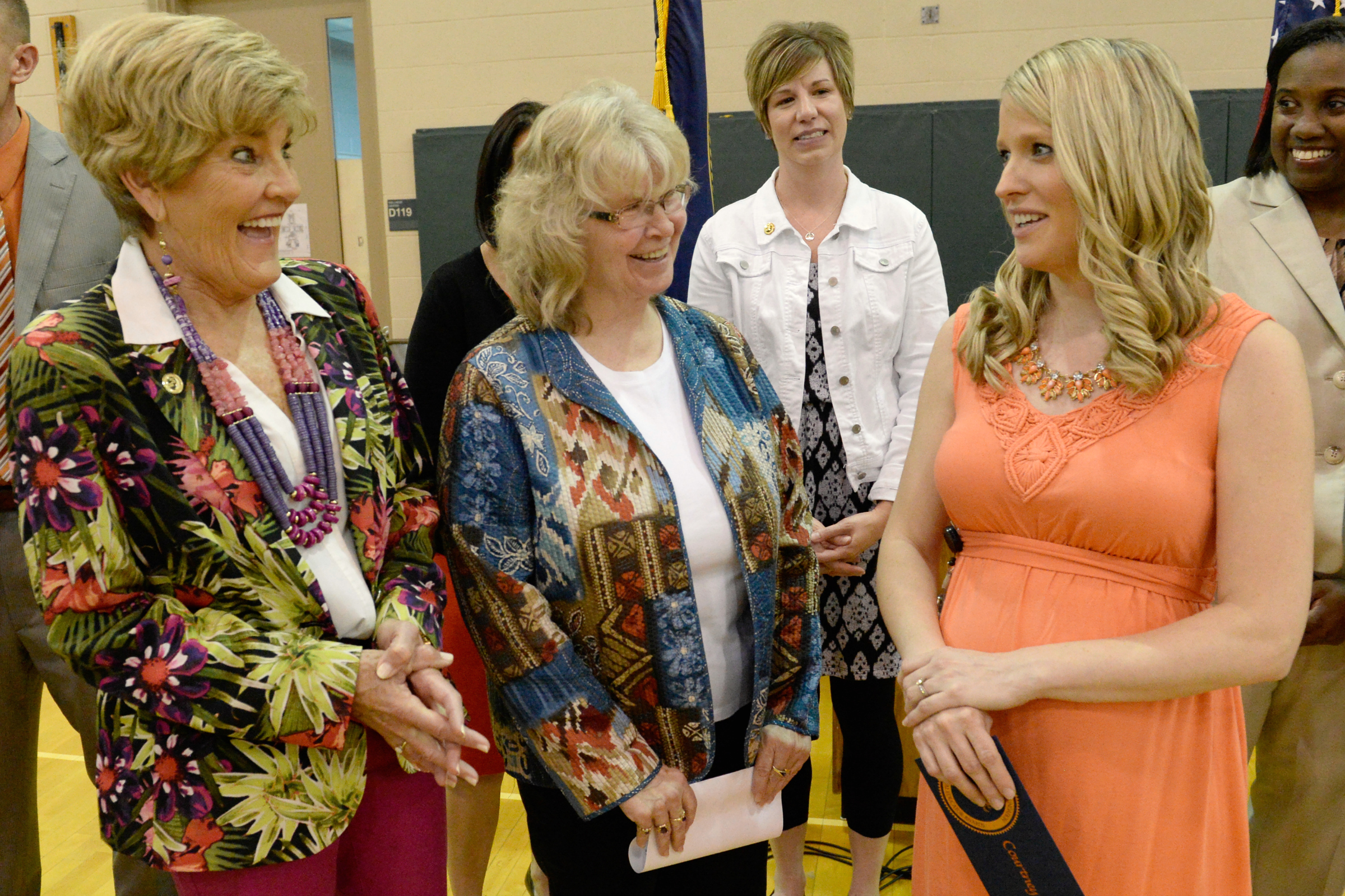 Beadle Middle School | Omaha, NE | Oct 21, 2015Courtney Matulka talks with veteran Nebraska Milken Educators after receiving her Milken Educator Award. From left, Laura Croom (NE '00), Carolyn Escamilla (NE '00), Sara Robinson (NE '12), Courtney Matulka (NE '15), Crystal Simpson (NE '08).