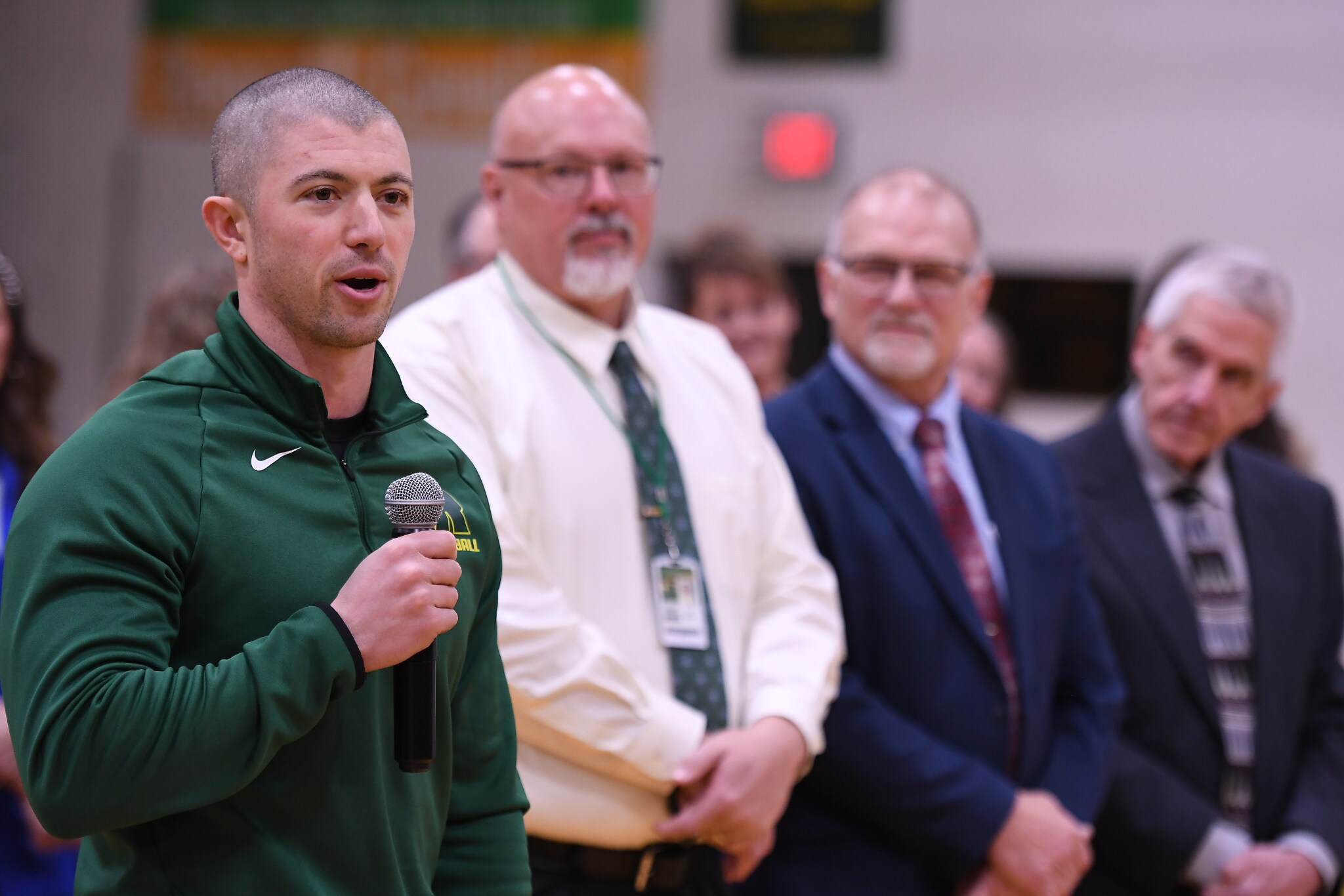 Roncalli Middle/Senior High School | Aberdeen, SD | Feb 13, 2025Dan Gallagher addresses the assembly with Roncalli Middle/Senior High School Principal Edward Mitzel, Roncalli Middle/Senior High School President Tim Weisz, and South Dakota Secretary of Education Dr. Joseph Graves proudly looking on.