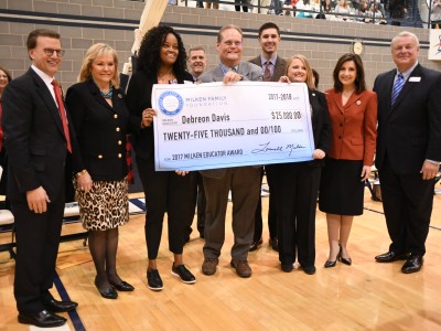 Edmond North High School | Edmond, OK | Dec 07, 2017Veteran Milken Educators talk about the impact the Milken Educator Award has had on their lives and careers. Says Jill Rumbaugh (OK '05, holding microphone): "It's the most humbling thing that will ever happen to you." Like today's recipient, Dr. Gary Stark (AR '01, far left) was also a principal when he received his Award and unknowingly planned his own surprise notification.