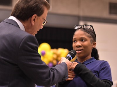 Good morning, Crestworth Elementary! Louisiana Superintendent of Education Dr. Cade Brumley is visiting to congratulate students and staff on being named a "Top Gains" school. But there's another reason for today's assembly, which comes to light when Lowell Milken, founder of the Milken Educator Awards, surprises third grade math and science teacher Derrick Winn with a Louisiana Milken Award and $25,000. No one is more shocked than the recipient himself! Follow along in the photos below to see how the surprise unfolded. Winn is the 2,974th Milken Educator awarded on the journey to the milestone 3,000th Milken Award announcement.