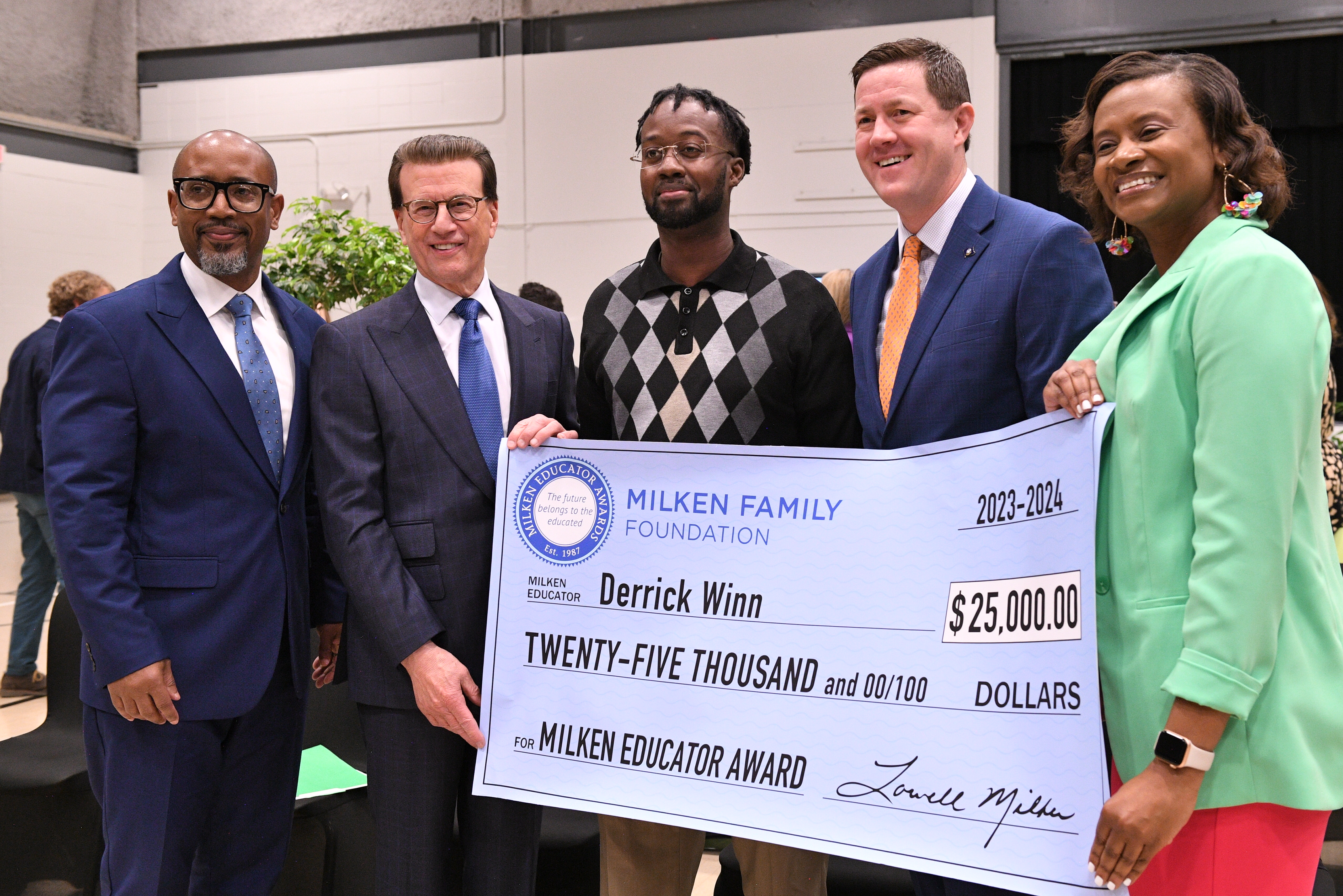 From left, East Baton Rouge Parish School System Interim Superintendent Adam Smith; Milken Educator Awards Founder Lowell Milken; recipient Derrick Winn (LA '23); Louisiana Superintendent of Education Dr. Cade Brumley; and Crestworth Elementary School Principal Candice Meyers.
