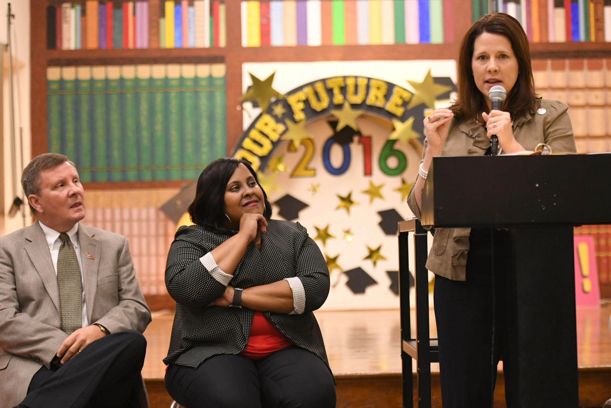 Jeanerette Elementary School | Jeanerette, LA | Oct 25, 2016Dr. Holly Boffy, vice president of the Louisiana Board of Elementary and Secondary Education (BESE), praises Jeanerette for its quick improvement as Iberia Parish School District Superintendent Dale Henderson (left) and Principal Devon Willis-Jones look on. “You came to a school that was struggling, and what did you do? You made it great," she says. A new mother, Boffy says that Jeanerette's "little tigers" inspire her to get back to work educating students. (The tiger is Jeanerette's mascot.) Boffy also reminds students of the qualities their teachers aim to instill in them. "You've got to have big dreams, persevere, and work hard, especially when things are not easy ... and have compassion," she says. The presentation then takes an unexpected turn when Boffy introduces a surprise guest: Lowell Milken, chairman and co-founder of the Milken Family Foundation.