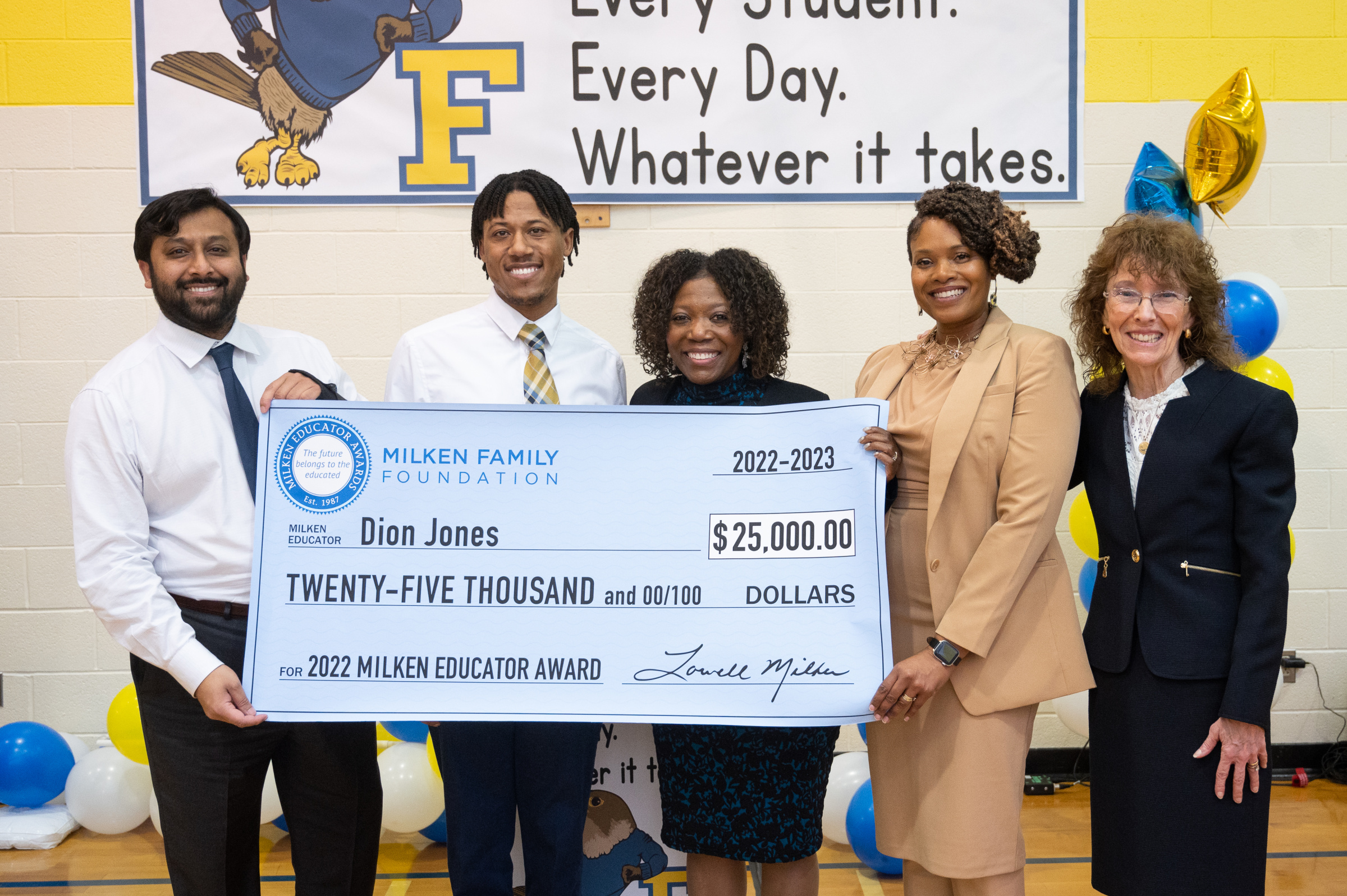 Fairland Elementary | Silver Spring, MD | Jan 10, 2023Milken Educator Award recipient Dion Jones gets a hand with the oversized $25,000 check bearing his name. The cash prize is unrestricted, so Mr. Jones can use the money however he likes.