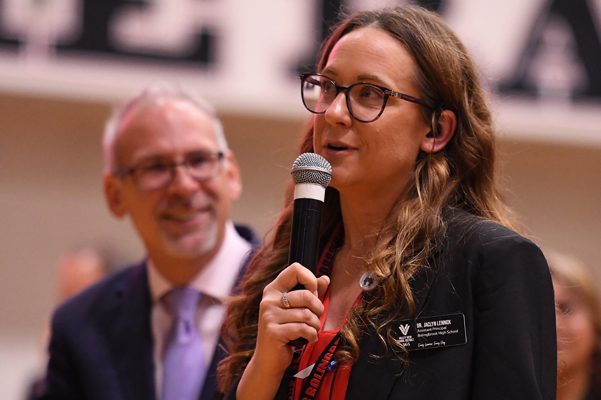 Dr. Jaclyn Lennox addresses students and staff with Illinois State Superintendent of Education Dr. Tony Sanders looking on. "It feels like I'm a small peice of a big puzzle," she says. "I'm honored and so thankful to work at this school."