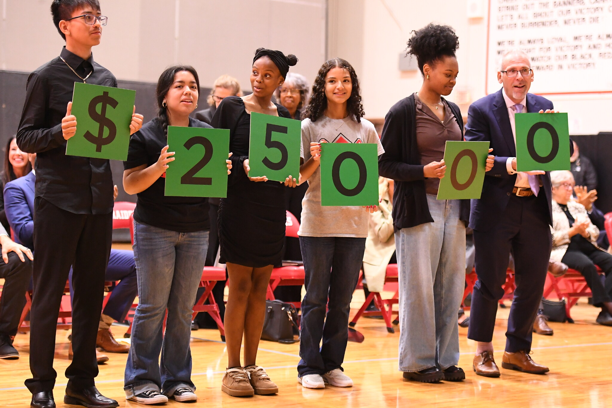 Bolingbrook High School | Bolingbrook, IL | Oct 16, 2025Milken Educator Awards Senior Vice President Dr. Jane Foley asks students to hold up cards representing the amount of the Milken Educator Award's cash prize. When Illinois State Superintendent Dr. Tony Sanders brings in a third zero, everyone gets excited: that makes $25,000!