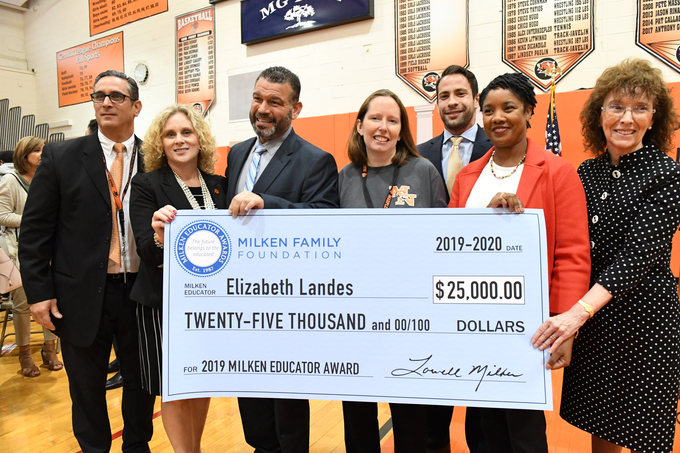 From left, Marple Newtown High School Principal John Beltrante; Marple Newtown School District Superintendent Dr. Tina Kane; Pennsylvania Secretary of Education Pedro A. Rivera; recipient Elizabeth Landes; Phil Innamorato, field representative for Pennsylvania U.S. Senator Pat Toomey; Ebony Staton Weidman, regional director for Pennsylvania U.S. Senator Bob Casey; and Dr. Jane Foley, senior vice president of the Milken Educator Awards.
