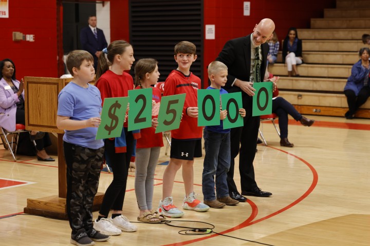 Drew Central Elementary School | Monticello, AR | Feb 23, 2023The Milken Educator Award includes a cash prize. How much? Students hold up cards representing the amount. When Arkansas Department of Education Secretary Jacob Oliva reveals a third zero, everyone starts to buzz: $25,000!