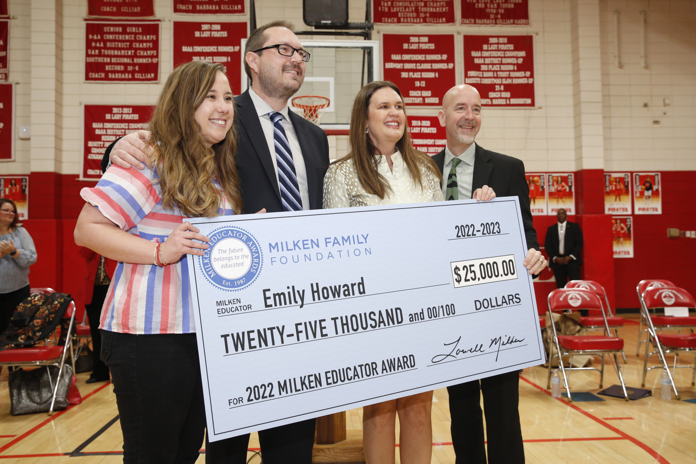Drew Central Elementary School | Monticello, AR | Feb 23, 2023Milken Educator Award recipient Emily Howard gets a hand with her oversized $25,000 check from visiting dignitaries. The cash prize is unrestricted — Milken Award recipients can use the funds however they choose.