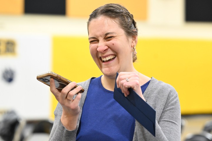 Emily Snyder calls her mom to share the good news: she's just received a Milken Educator Award and $25,000!