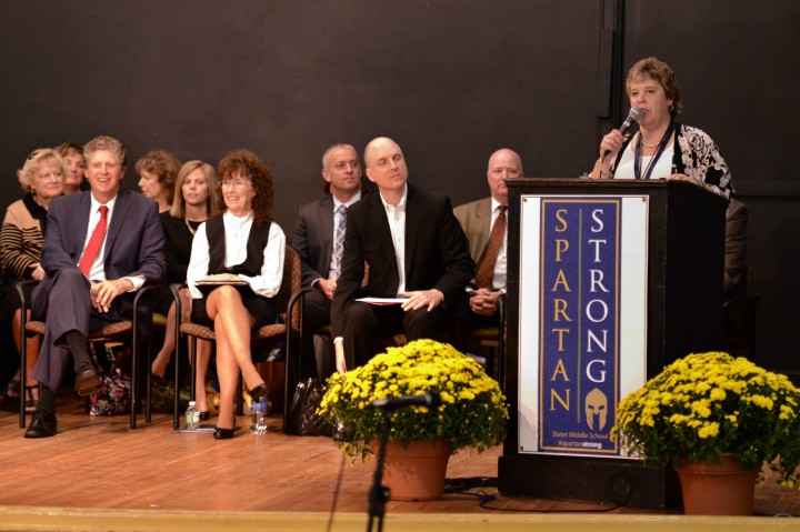 Samuel Slater Junior High | Pawtucket, RI | Oct 14, 2015With a large group of honored guests assembled on the stage in the auditorium of Samuel Slater Junior High, Principal Dr. Jacqueline E. Ash gets the assembly rolling.