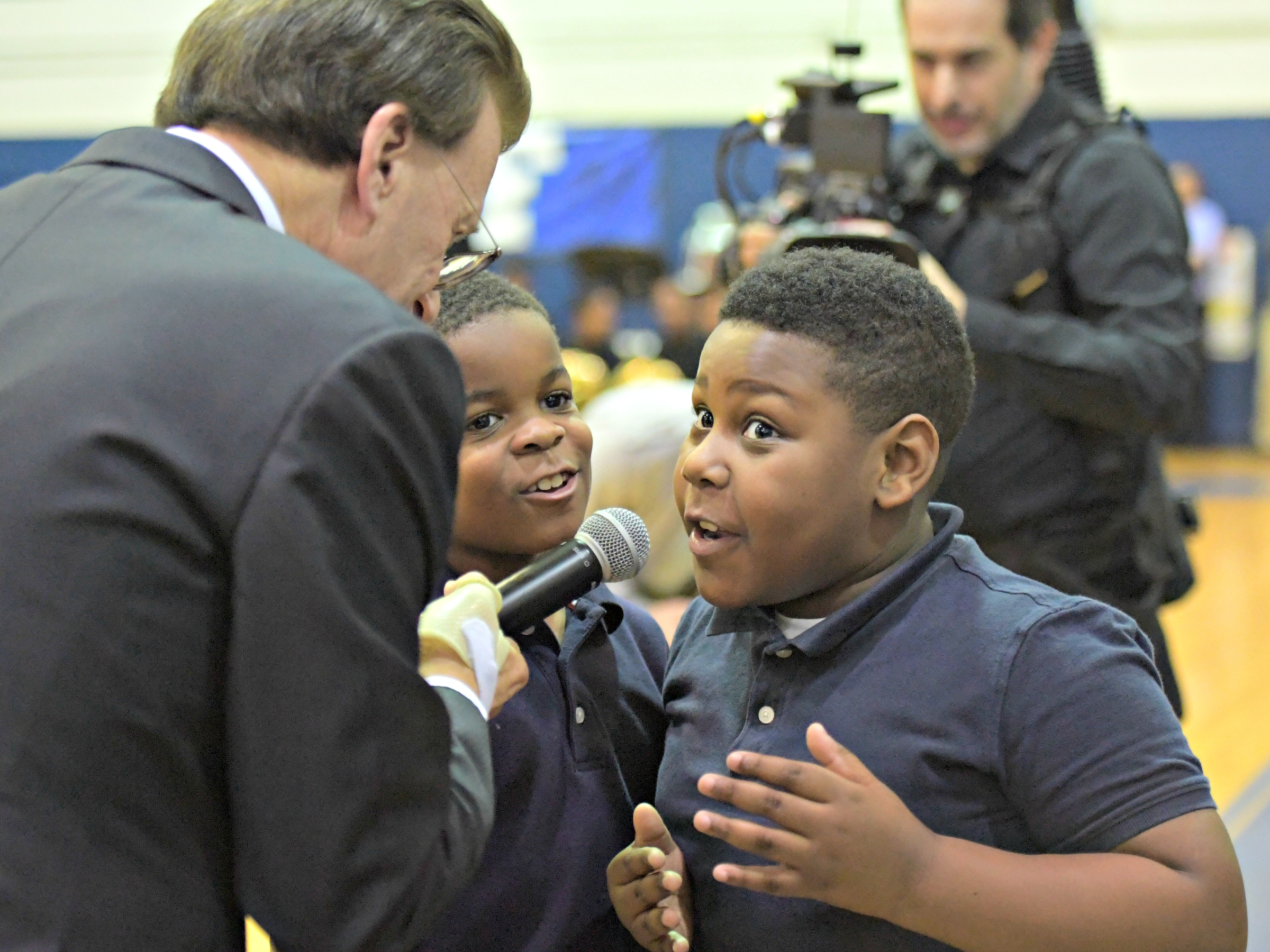 John P. Freeman Optional School | Memphis, TN | Oct 25, 2018With cameras looking on, Milken Family Foundation Chairman and Co-Founder Lowell Milken talks with excited students at the assembly.