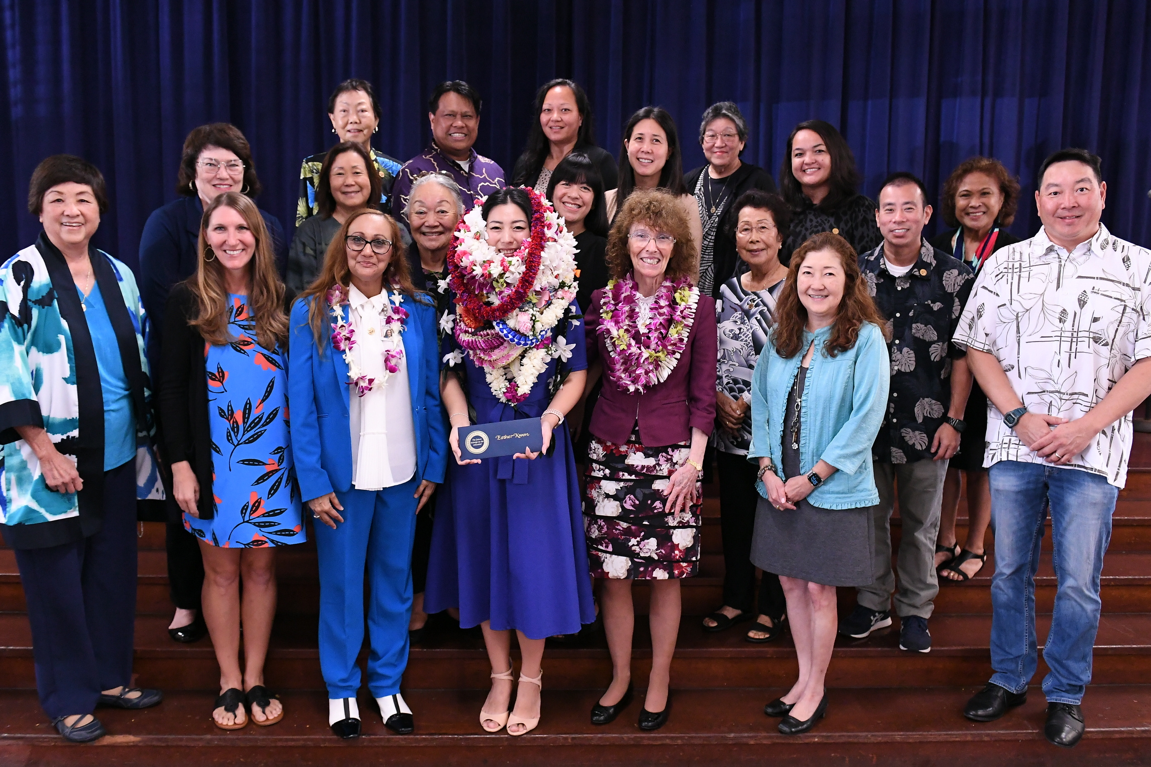 Front row, from left: Estelle Wong (HI '99); Kelly Sutcliffe (HI '16); Dr. Bebi Zamina Khan Davis (HI '05); recipient Esther Kwon (HI '22); Dr. Jane Foley (IN '94), senior vice president of the Milken Educator Awards; Dr. Teri M. Ushijima (HI '06).