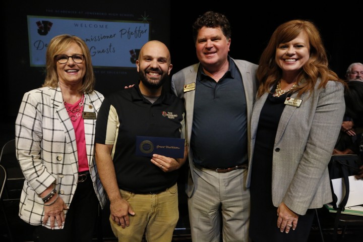 From left, Jonesboro Public Schools Superintendent Dr. Kim Wilbanks, a 1991 Arkansas Milken Educator; recipient Grant Harbison; and Jonesboro Public Schools Assistant Superintendents Dr. William Cheatham and Misty Doyle.