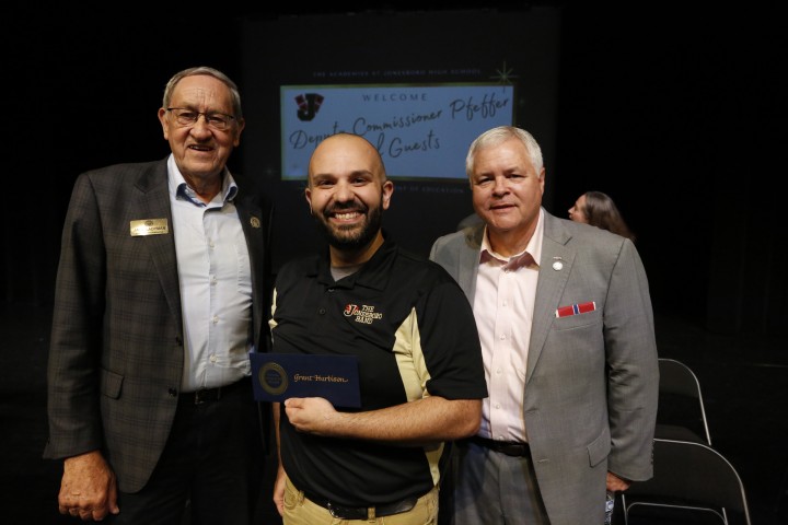 The Academies at Jonesboro High School | Jonesboro, AR | May 11, 2022Arkansas State Representatives Jack Ladyman (left) and Brandt Smith join the chorus of congratulations for Milken Educator Award recipient Grant Harbison.