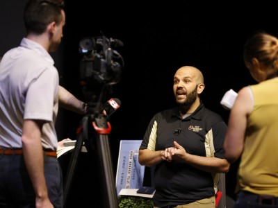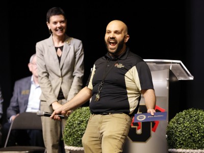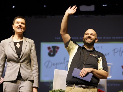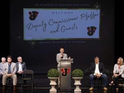 The Academies at Jonesboro High School | Jonesboro, AR | May 11, 2022Nicole Bolen, executive director of services for the National Institute for Excellence in Teaching, congratulates Grant Harbison on his Milken Educator Award.
