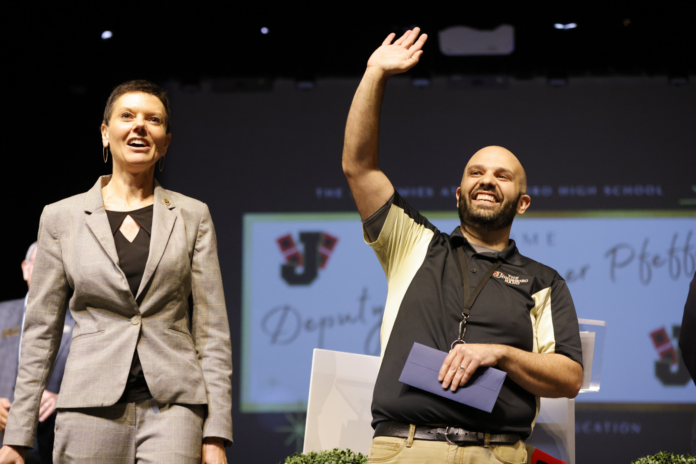 The Academies at Jonesboro High School | Jonesboro, AR | May 11, 2022Still trying to process what's happening, music teacher Grant Harbison waves to the students and colleagues who continue their long ovation while Milken Educator Awards Vice President Stephanie Bishop looks on with delight.