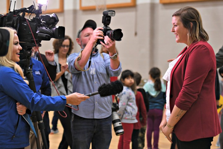 Madison Elementary | Norman, OK | Oct 23, 2018Surrounded by cameras and microphones, Milken Educator Award recipient Hailey Couch tells reporters that she and her husband are hoping to buy a house—and that her Milken Award will help a lot. "This is life-changing," she says.