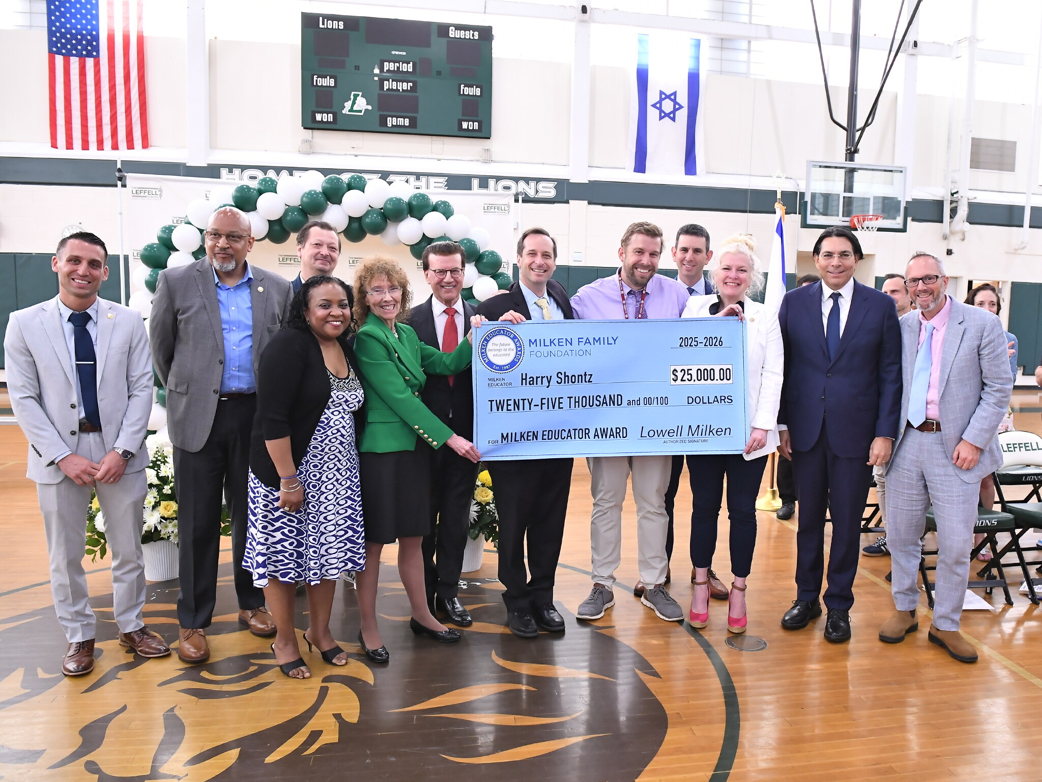 The Leffell School | Hartsdale, NY | Apr 17, 2026Harry Shontz gets a hand with his oversized $25,000 check from veteran Milken Educators and dignitaries.