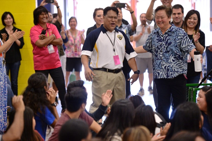 Waipahu High School | Waipahu, HI | Jan 29, 2016Michael Sana, Hawaii's newly crowned 2015-16 Milken Educator Award recipient, breaks into a huge smile as the students, staff and guests gathered at Waipahu High School give him a standing ovation.