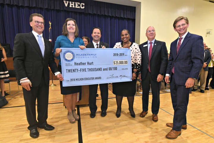 Vestavia Hills Elementary School Central | Vestavia Hills, AL | Oct 24, 2018Visitors give Heather Hurt a hand with her oversized Milken Educator Award check.