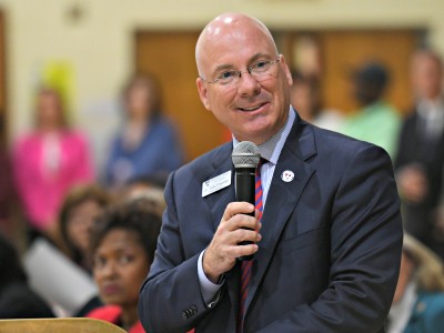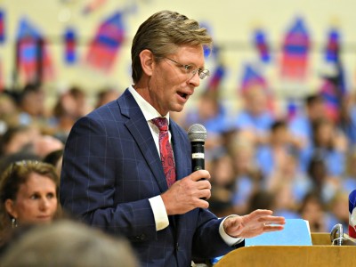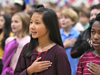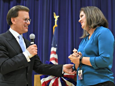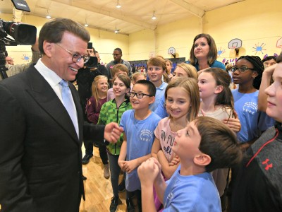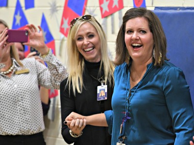 Vestavia Hills Elementary School Central | Vestavia Hills, AL | Oct 24, 2018Holding her blue Milken Educator Award envelope, Heather Hurt leads her students back to the classroom after the eventful assembly.