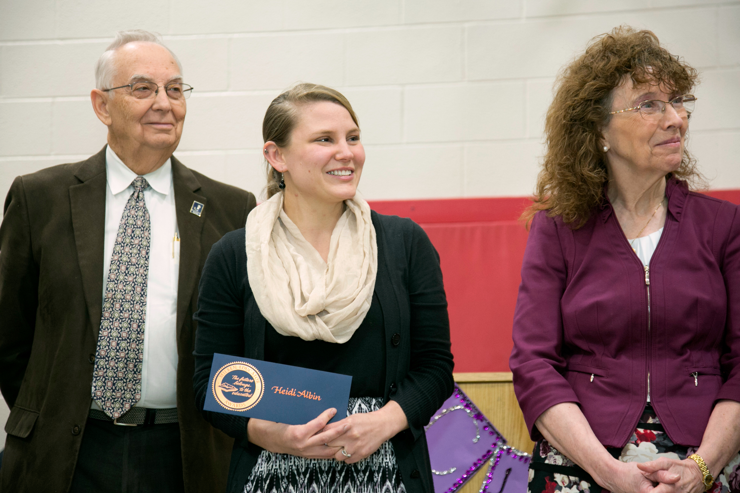 From left, Kansas Deputy Commissioner of Education Dale Dennis; recipient Heidi Albin; and Dr. Jane Foley, senior vice president of the Milken Educator Awards.