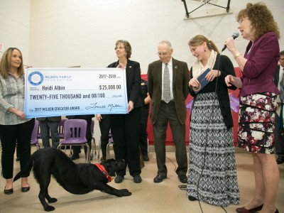 Milken Educator Award recipient Heidi Albin (center) has a moment to collect her thoughts as speakers talk about her sizable contributions to Complete High School Maize. When Albin discovered students lacked hope about their future, she implemented an individualized plan of study for each student that included classes to take, potential careers, guest speakers, job shadows and interview preparation skills. Not only did the students’ future perceptions and self-worth develop, so did concrete parts of their learning such as improved attendance, reduced dropouts and increased graduation rates. Ninety-five percent of her students graduate high school and 92 percent are either employed or enrolled in higher education five years after graduation.