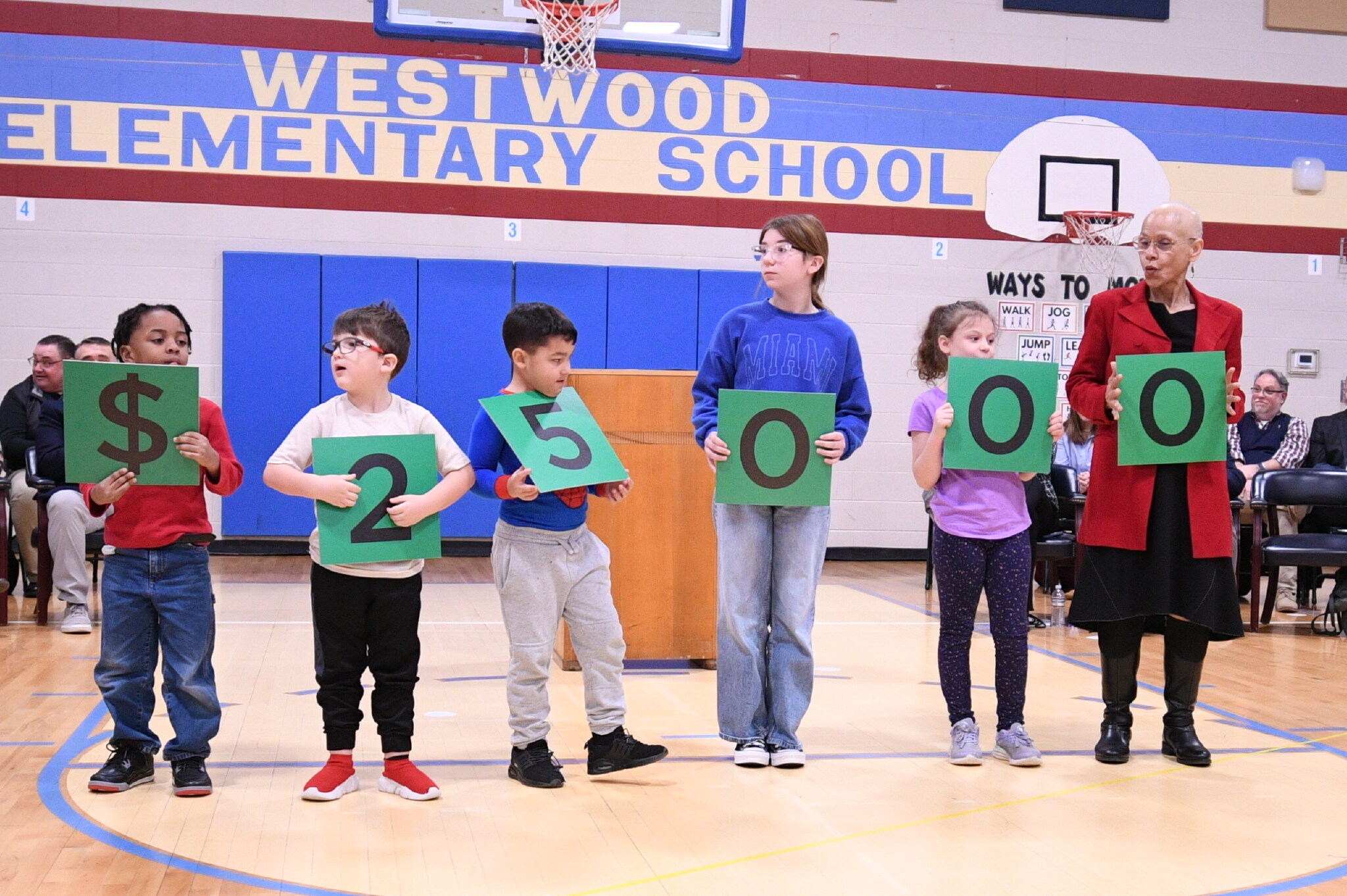 The Milken Educator Award includes a cash prize. How much? Students hold up cards representing the amount. When Tennessee Commissioner of Education Lizzette Reynolds reveals a third zero, everyone applauds: that makes $25,000!