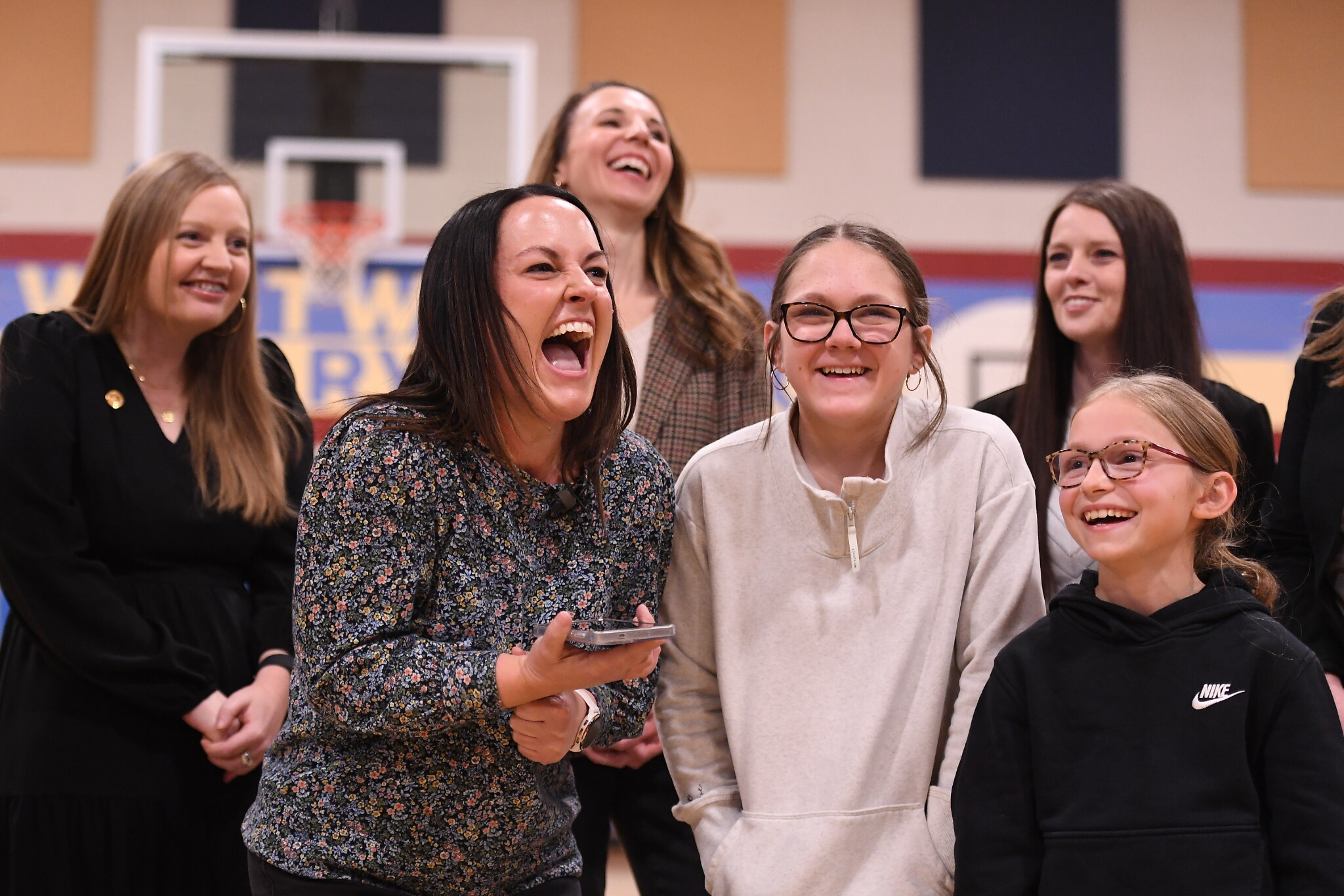 Westwood Elementary School | Manchester, TN | Jan 21, 2026Surrounded by veteran Milken Educators and her daughters, Holly Logan calls her mom to let her know about her Milken Educator Award.