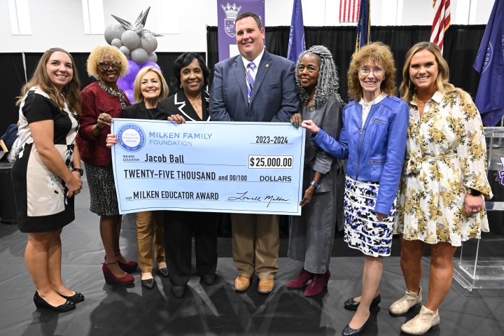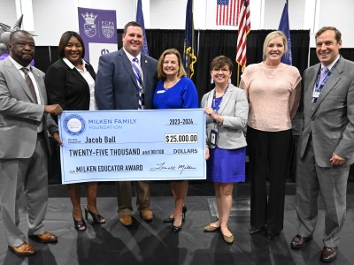 From left, Laura Cole (KY '19); Donna Bryant-Johnson (KY '94); Cyndi Boggs (KY '00); Jacqueline Austin (KY '96); recipient Jacob Ball (KY '23); Rosalind Hurley-Richards (KY ‘96); Milken Educator Awards Senior Vice President Dr. Jane Foley (IN '94); and Angie Beavin (KY '18).