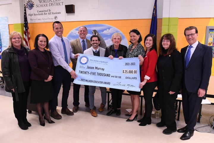 Florence Drake Elementary School | Sparks, NV | Feb 07, 2023Colleagues, visiting dignitaries and veteran Milken Educators give third and fourth grade teacher Jason Murray a hand with his oversized Milken Educator Award check. The $25,000 cash prize is unrestricted — recipients can use the funds however they choose.