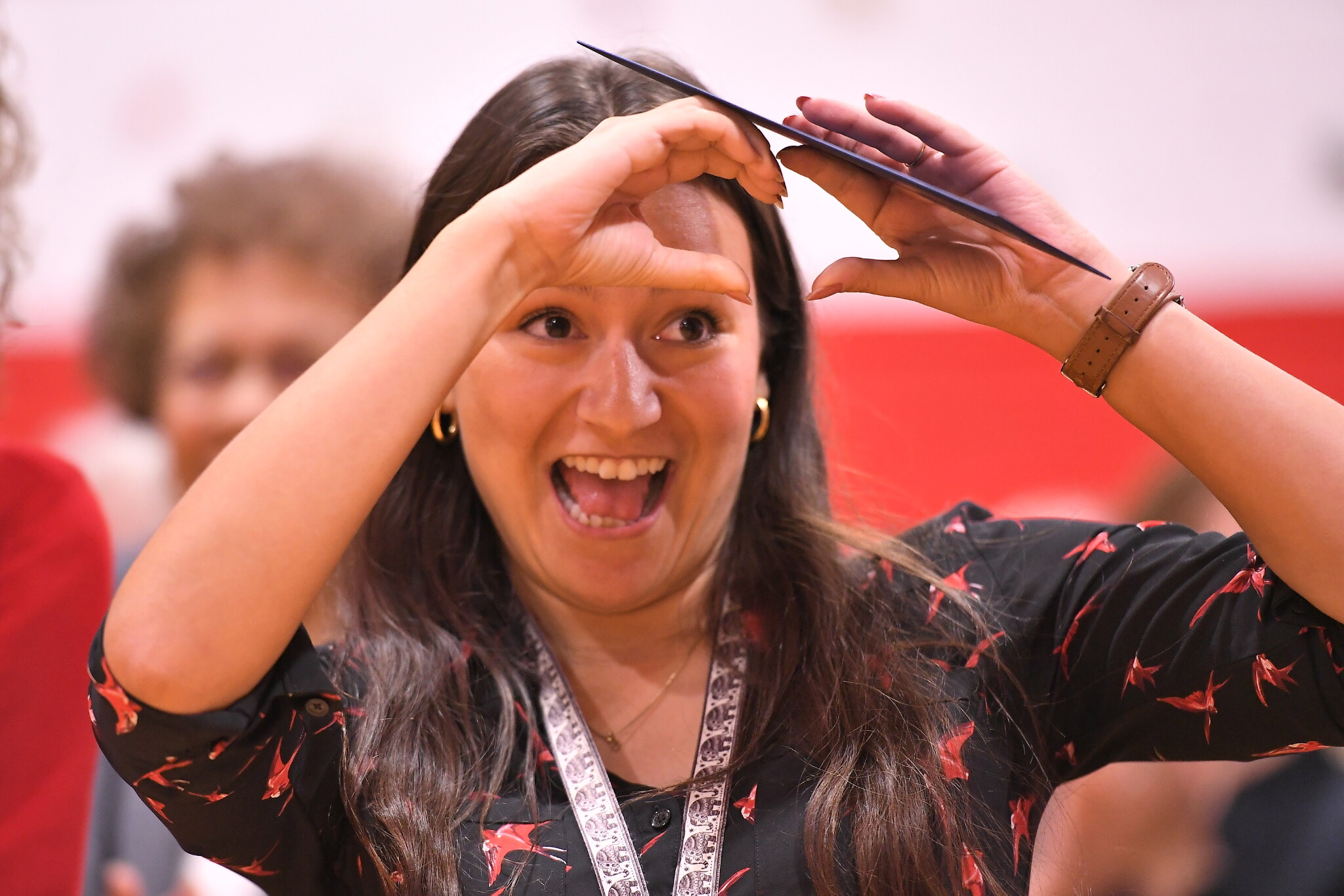 Jeanette Capritti accepts her Milken Educator Award, then makes a heart gesture towards students and colleagues as they cheer for her.