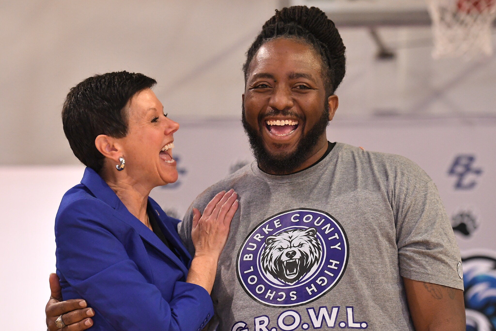 Milken Educator Awards Vice President Stephanie Bishop congratulates Jeffery Heggs with a hug.