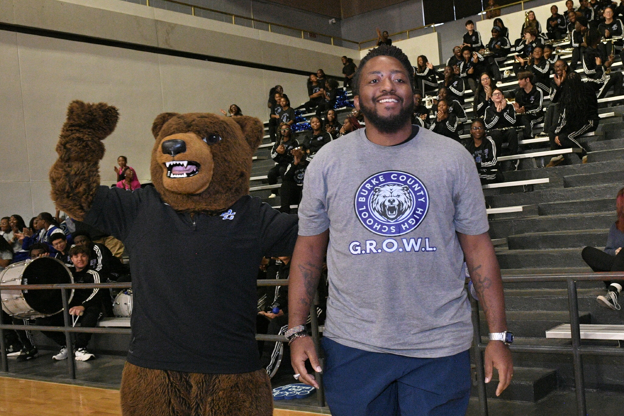 Burke County High School | Waynesboro, GA | Nov 21, 2025Jeffery Heggs makes his way to the front of the gym to accept his Award, while the Burke County High School mascot, students and staff proudly cheer him on.