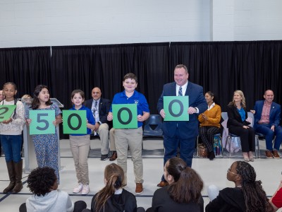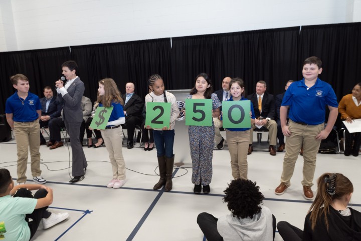 Pearl Upper Elementary | Pearl, MS | Jan 10, 2024Special guest Stephanie Bishop, vice president of the Milken Educator Awards, reveals that one outstanding teacher at Pearl Upper Elementary is about to receive a prestigious national award and a cash prize—but how much? Student volunteers hold up cards representing the amount of the Milken Educator Award, one digit at a time. But wait, there may be more zeroes to add!