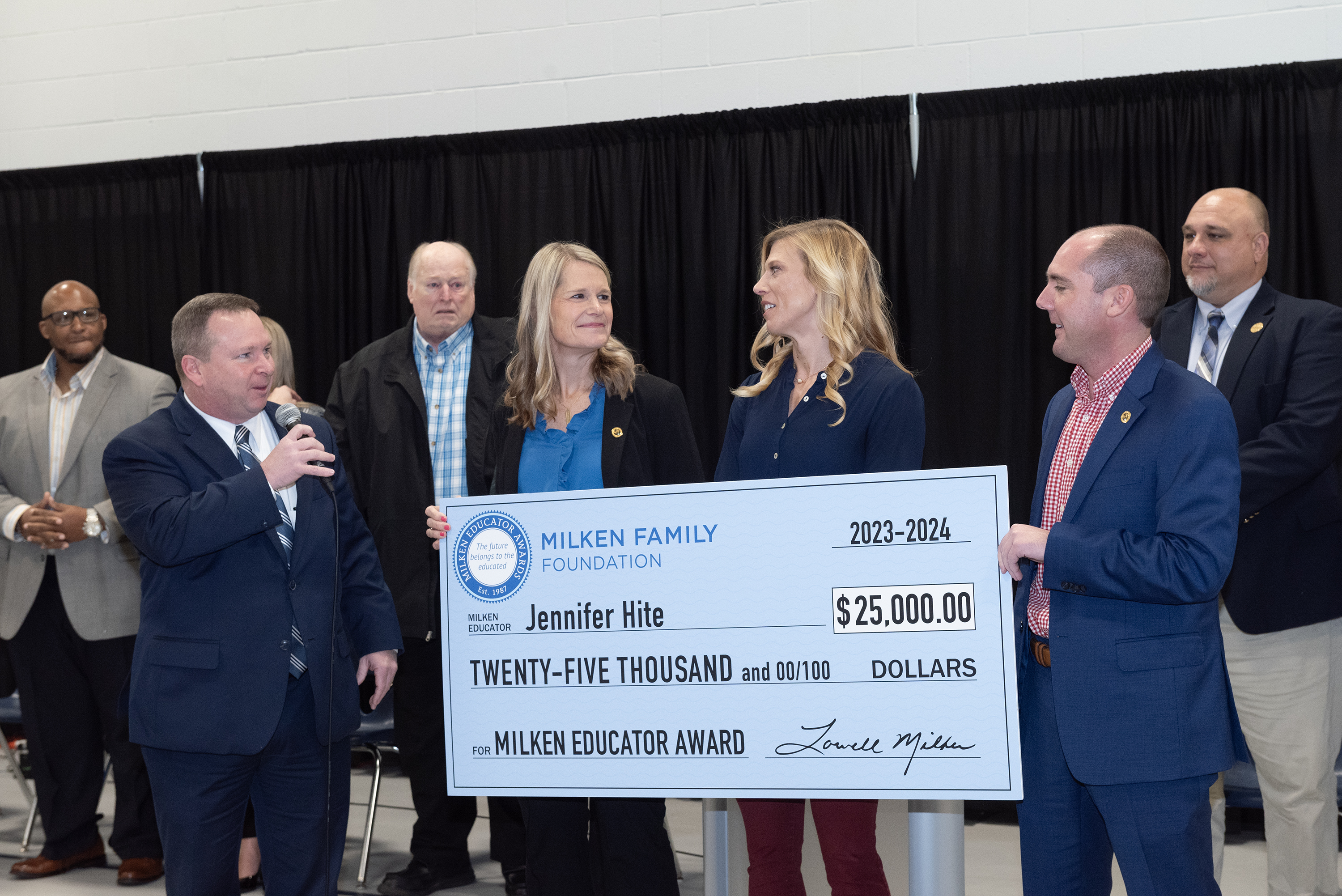 Pearl Upper Elementary | Pearl, MS | Jan 10, 2024Mississippi Interim State Superintendent of Education Dr. Raymond C. Morgigno congratulates Milken Educator Award recipient Jennifer Hite.
