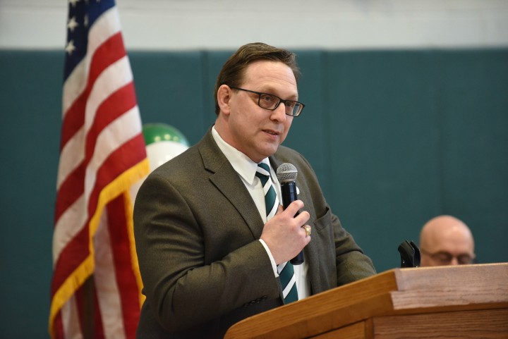 Ponaganset High School | North Scituate, RI | Jan 15, 2020Foster-Glocester District Superintendent Michael S. Barnes introduces some of the dignitaries joining the assembly. Superintendent Barnes, a 1997 Rhode Island Milken Educator, knows what lies ahead—but he's not telling!