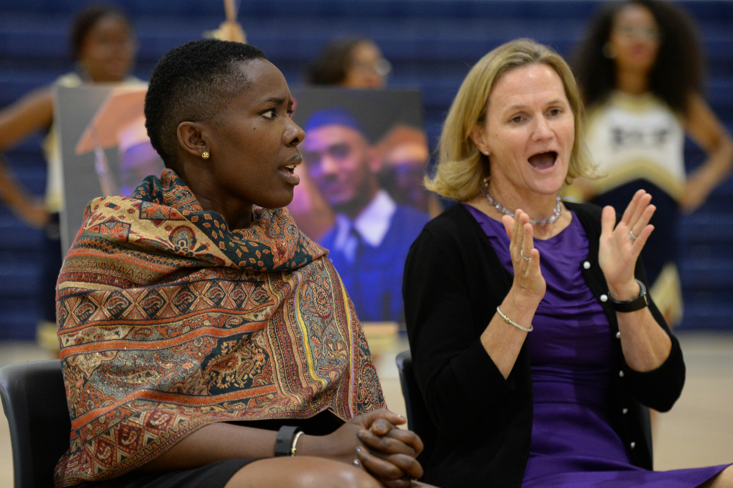 KIPP DC College Preparatory Principal Jessica Cunningham is stunned when Milken Family Foundation Chairman and Co-Founder Lowell Milken announces her name as the recipient of the 2015 Milken Educator Award while KIPP DC Founder and CEO Susan Schaeffler applauds.