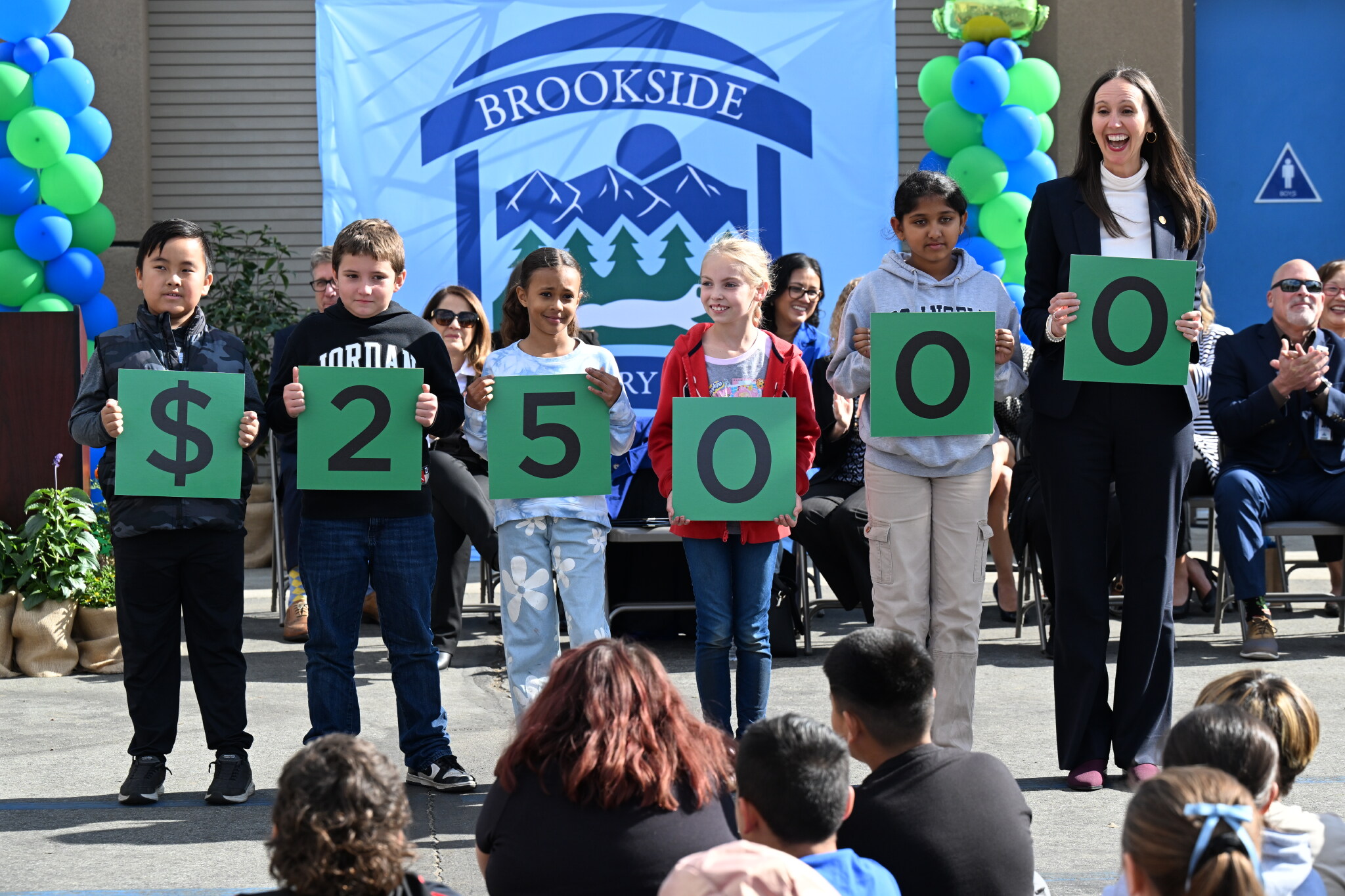 Brookside Elementary School | Beaumont, CA | Nov 20, 2025Students hold up cards showing the amount of the cash prize the educator will receive. Milken Educator Awards Vice President Jennifer Fuller reveals the final zero: that makes $25,000!