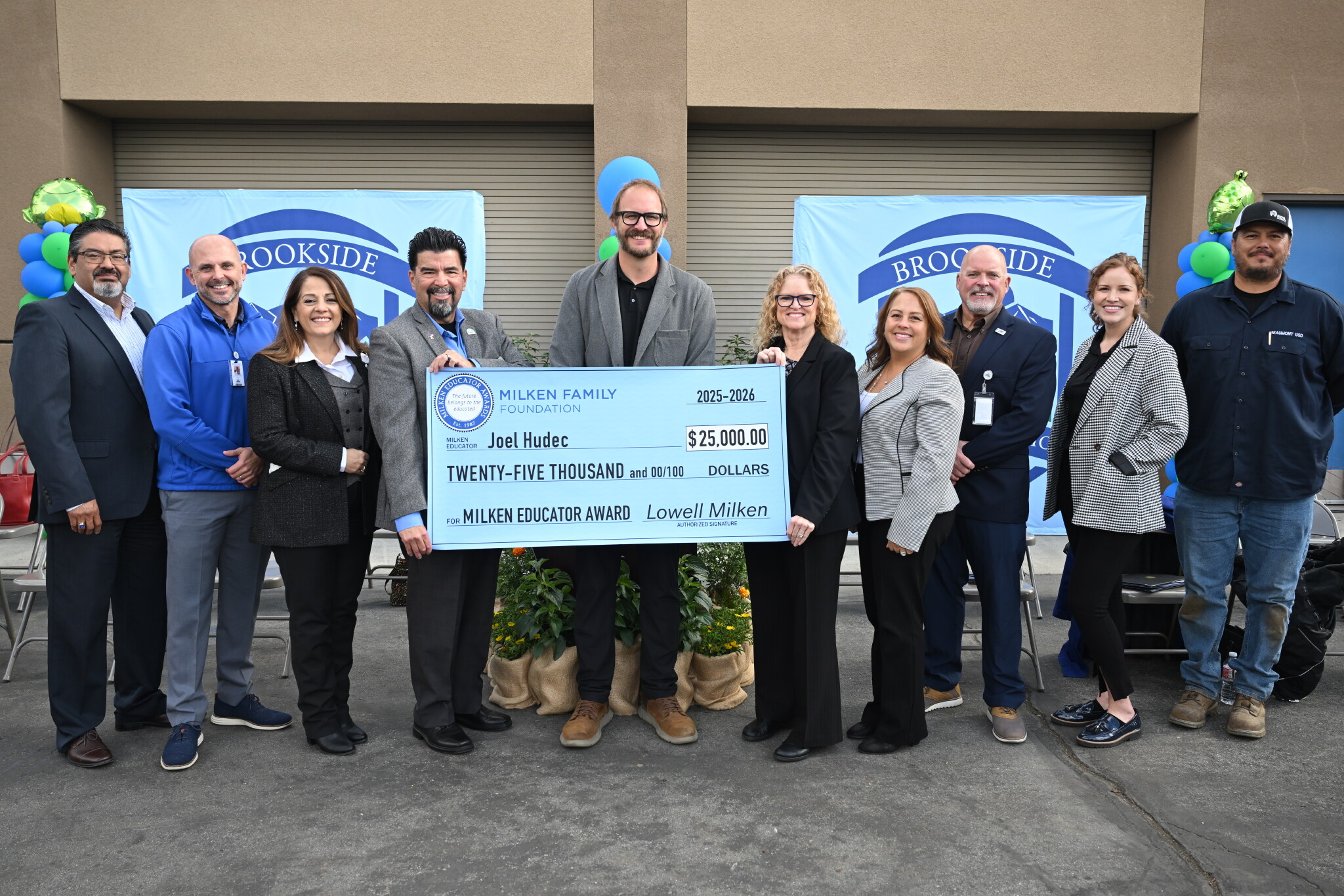 Brookside Elementary School | Beaumont, CA | Nov 20, 2025Principal Joel Hudec gets a hand with his oversized check.