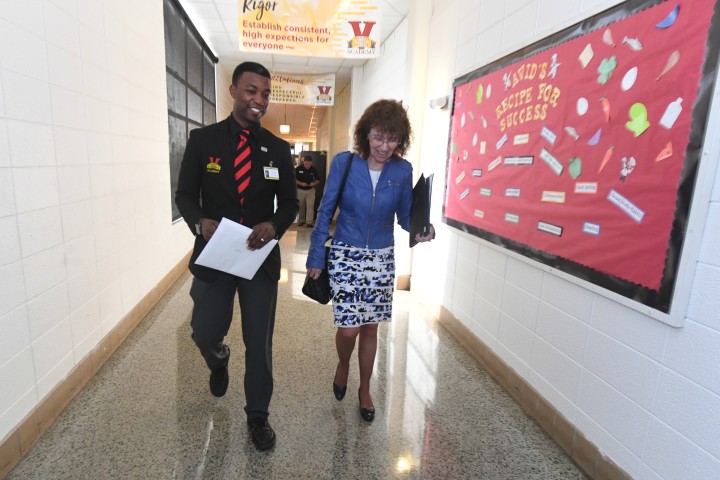 Valdosta Early College Academy | Valdosta, GA | Oct 10, 2019After the assembly, Dr. Johnnie Marshall gives Dr. Jane Foley, senior vice president of the Milken Educator Awards, a tour of VECA. In a school where sixth-graders arrive lagging their peers academically and with risk factors for high school graduation, VECA seniors leave with at least one year of dual-enrollment college credit and scholarships to help them in their future studies.