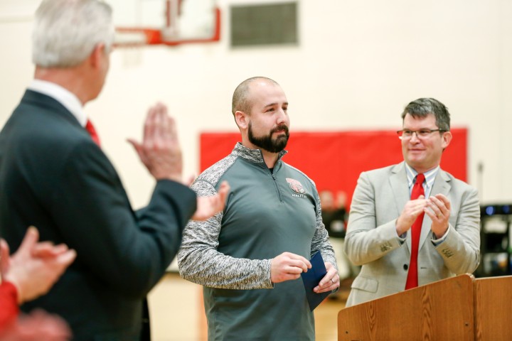 South Sioux City Middle School | South Sioux City, NE | Jan 11, 2018Flanked by Nebraska Lieutenant Governor Mike Foley (left) and Greg Gallagher, senior program administrator of the Milken Family Foundation, Jon Pickinpaugh listens to the long ovation from his students and colleagues. In addition to his duties teaching science, Pickinpaugh coaches wrestling and football and believes that character education is a vital part of coaching. Spending time with his students in the weight room gives him an opportunity to talk with them about life outside of school; many students see him as a father figure.