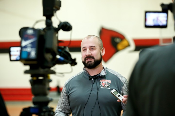 South Sioux City Middle School | South Sioux City, NE | Jan 11, 2018Surrounded by cameras and microphones, Jon Pickinpaugh talks with reporters at his surprise Milken Educator Award notification. Pickinpaugh has led the school’s development and implementation of Nebraska Science State standards and uses a variety of instructional strategies in his classroom, including bell ringers, videos, direct instruction, gradual release of responsibility, stations and hands-on lessons.
