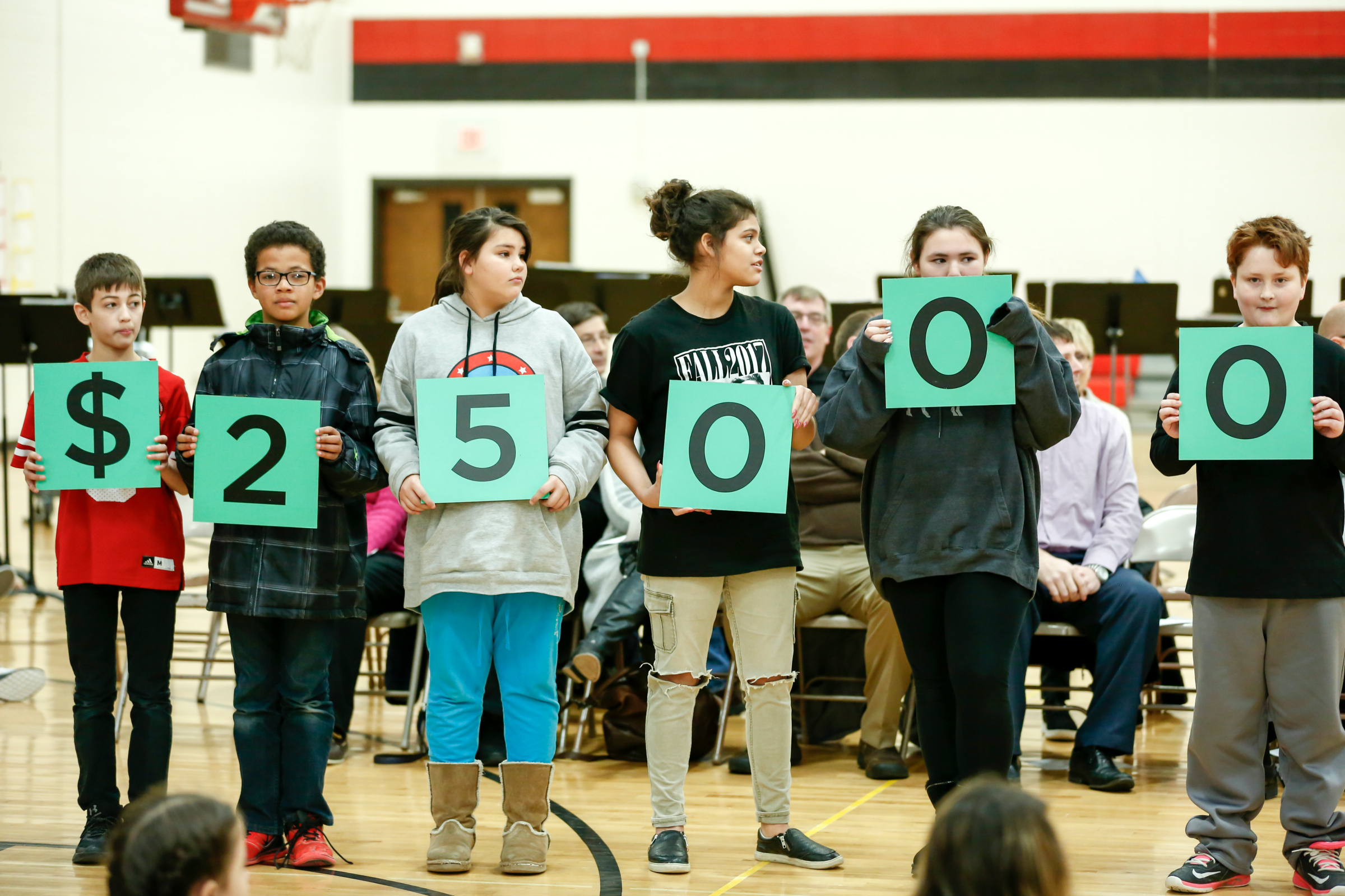 One teacher at South Sioux City Middle School is about to receive Nebraska's 2017-18 Milken Educator Award—and a financial prize! One digit at a time, students hold up cards representing the amount of the Award. When the final zero appears, the crowd gives a collective gasp: That's $25,000!