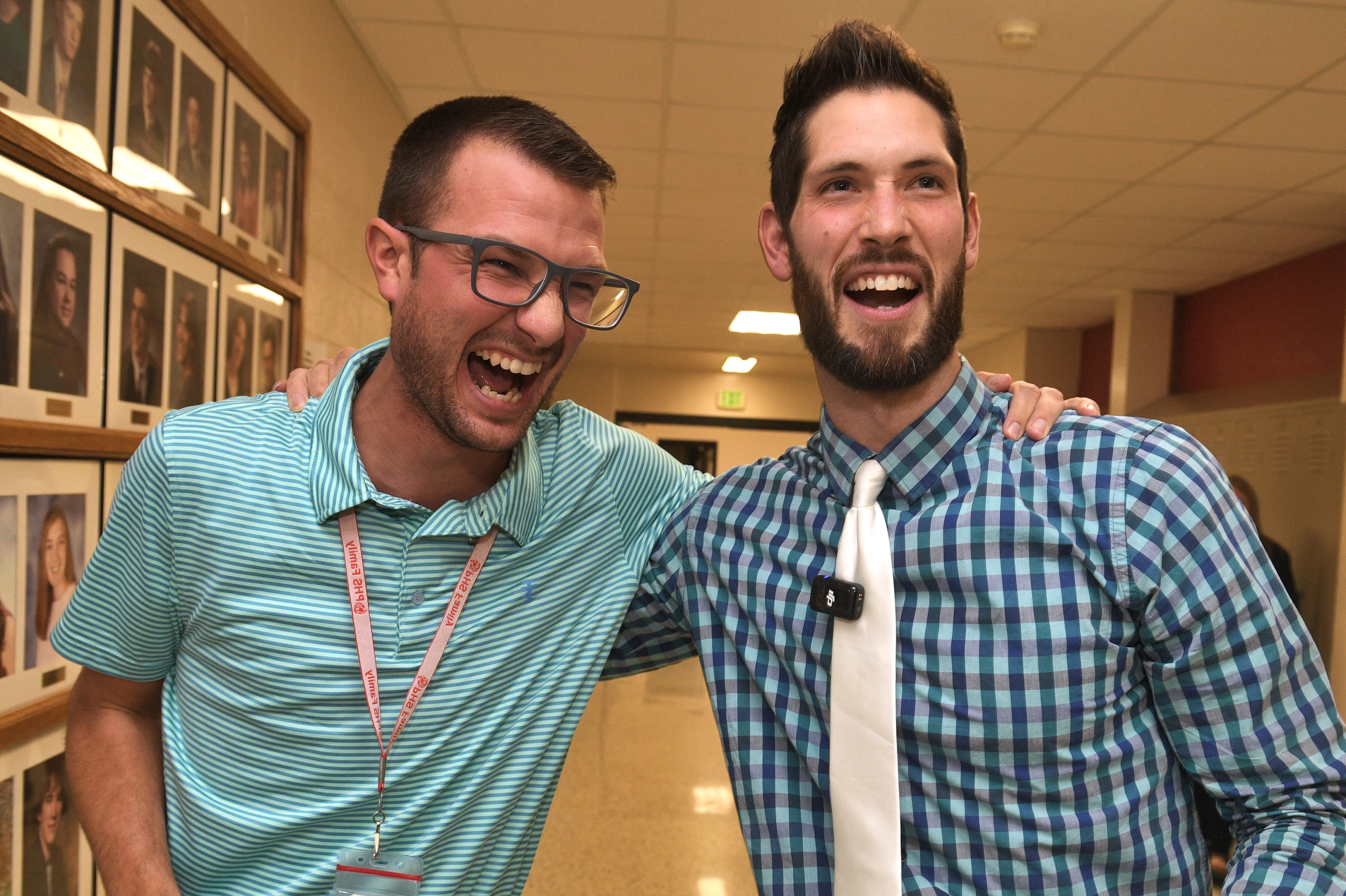 Plymouth High School | Plymouth, IN | Nov 09, 2023On the way back to his classroom, Josh Dingeldein receives congratulations from a colleague.