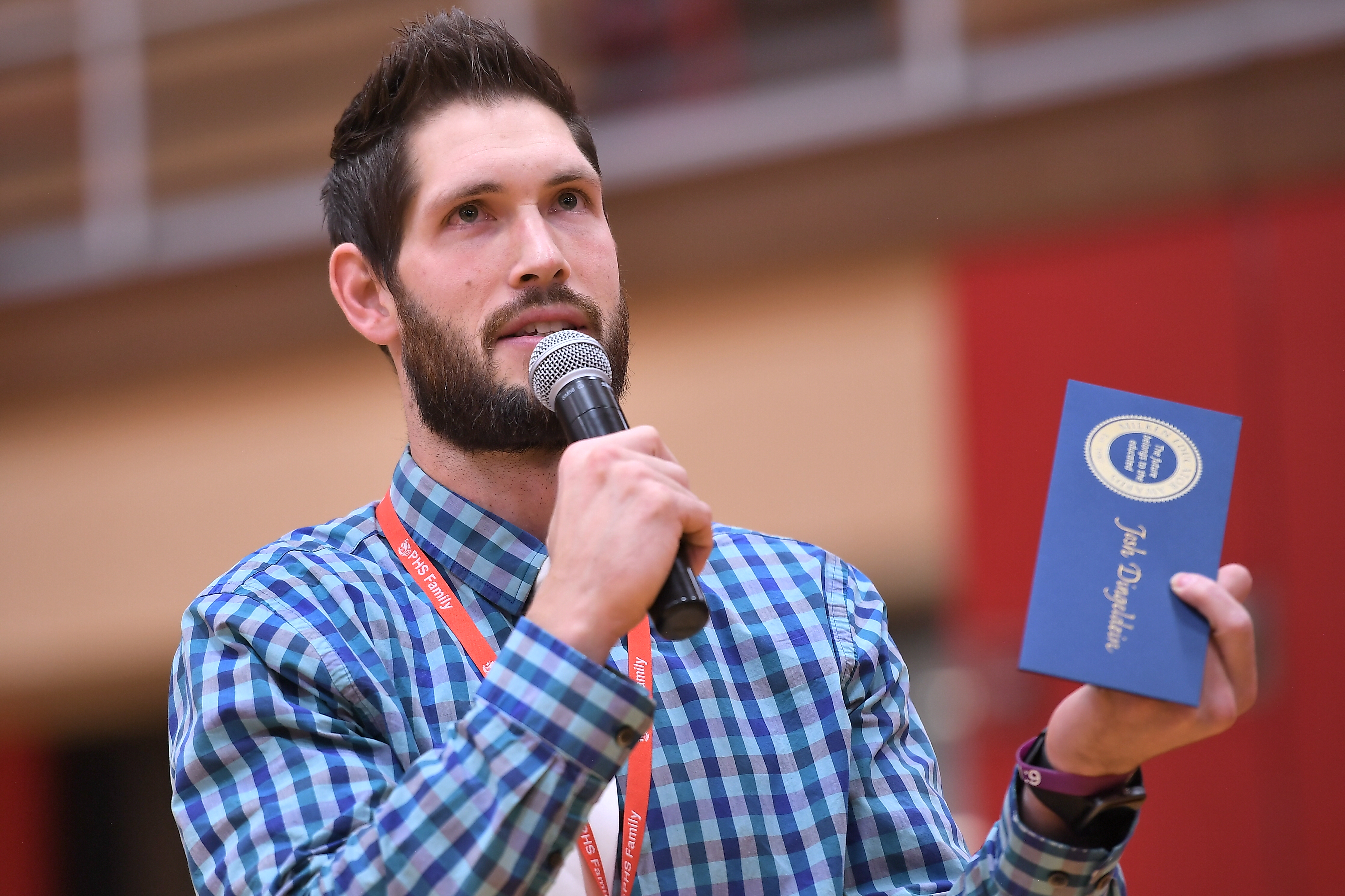 Plymouth High School | Plymouth, IN | Nov 09, 2023Still in shock, teacher Josh Dingeldein thanks the students, colleagues and guests who have gathered in Plymouth High School's gymnasium for his surprise Milken Educator Award notification.