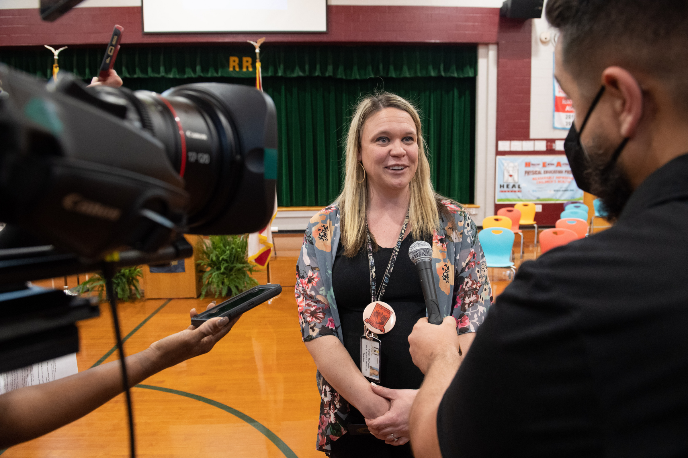 Rocky Ridge Elementary | Hoover, AL | Mar 04, 2022Ms. McPeake is the star of the day! Reporters crowd around Kaitlin McPeake to record her reactions to today's huge Milken Educator Award surprise.