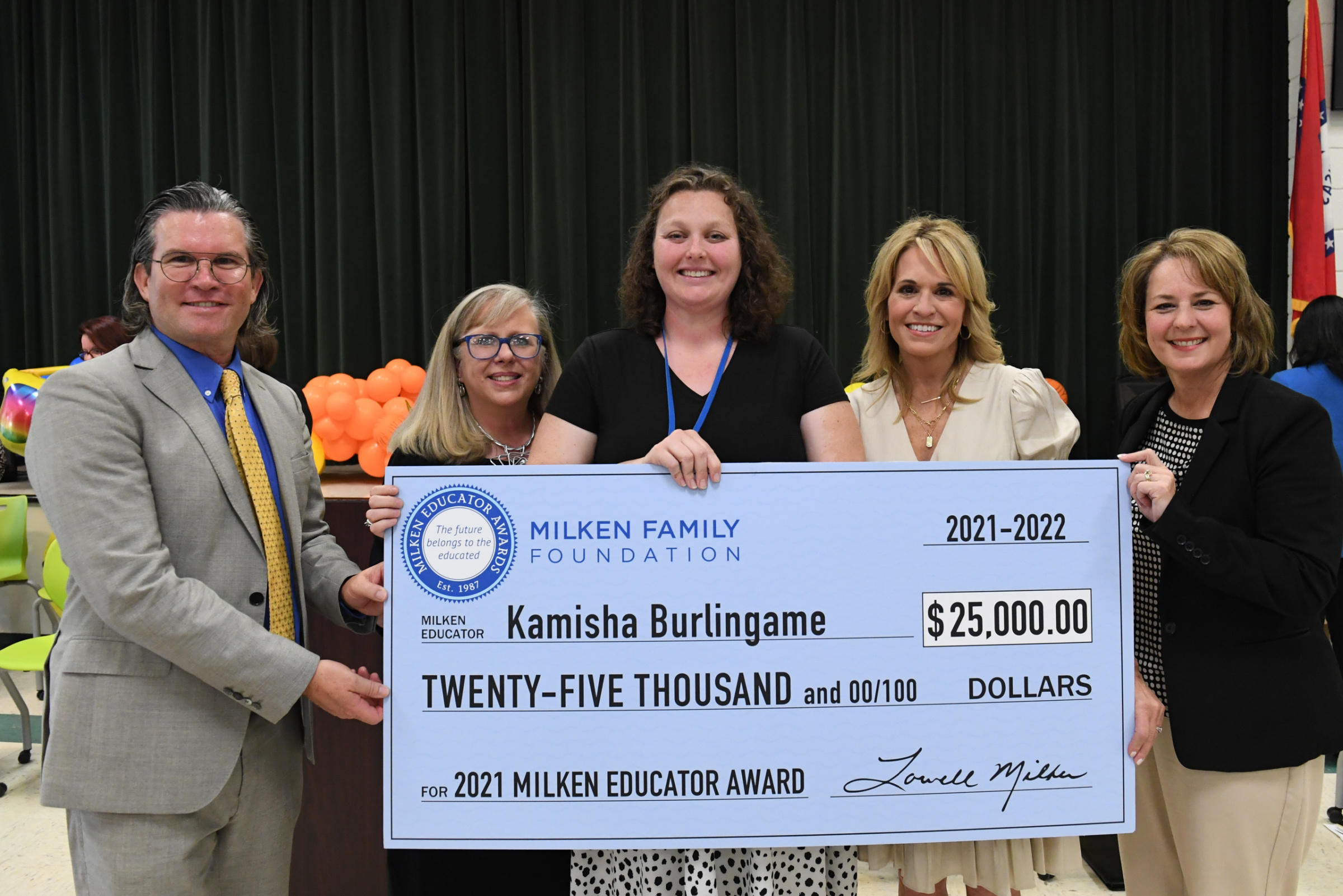 Thomas Jefferson Elementary | Bentonville, AR | Apr 27, 2022Colleagues and visitors help Kamisha Burlingame hold up her giant $25,000 Milken Educator Award check. The cash prize is unrestricted, so recipients can spend the money however they choose.